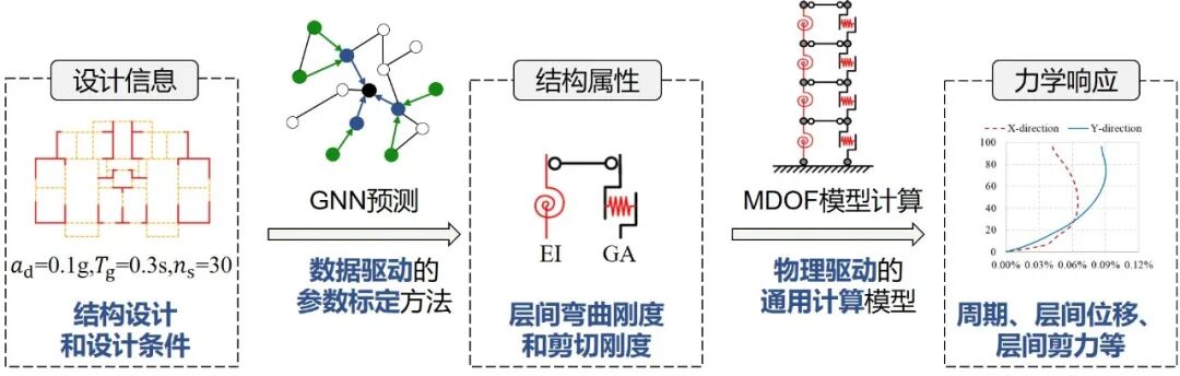 首先,利用数据驱动方法的学习能力和非线性拟合能力,在大量案例上训练了一个图神经网络(GNN)。将结构设计信息输入给训练好的GNN,它就可以预测出关键结构参数,例如层间弯曲刚度EI和剪切刚度GA。然后,利用物理驱动模型通用性强的优势,基于关键结构参数建立弯剪耦合MDOF模型,通过模态分析、反应谱分析等得到所需的地震响应。