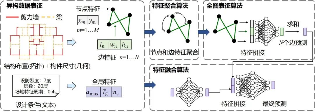 结构设计信息包含拓扑、几何、文本等多种异构数据。本研究将结构布置、构件尺寸、设计条件分别表征为图谱结构、图谱特征、向量,再通过GNN进行特征提取、融合和映射,如下图所示。相关方法去年发表于CACAIE[3],公众号也做过介绍(详见:揭秘:AI如何做到1秒内算出用钢量?| 新论文:基于知识增强图神经网络的建筑结构材料用量评估方法)。这个方法的好处是可以无损地表征剪力墙结构中宏观(如设防烈度)、中观(如平面布置)和微观(如截面尺寸)的各类信息。
