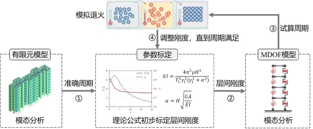 为了精准获得训练集MDOF模型参数,首先建立了超过1000个剪力墙建筑的有限元模型,然后通过模态分析获得其自振周期。再基于理论公式和模拟退火算法,调整MDOF模型参数直至MDOF模型可以精准预测结构的自振周期。最后用这些标定好的MDOF模型作为GNN训练的数据。