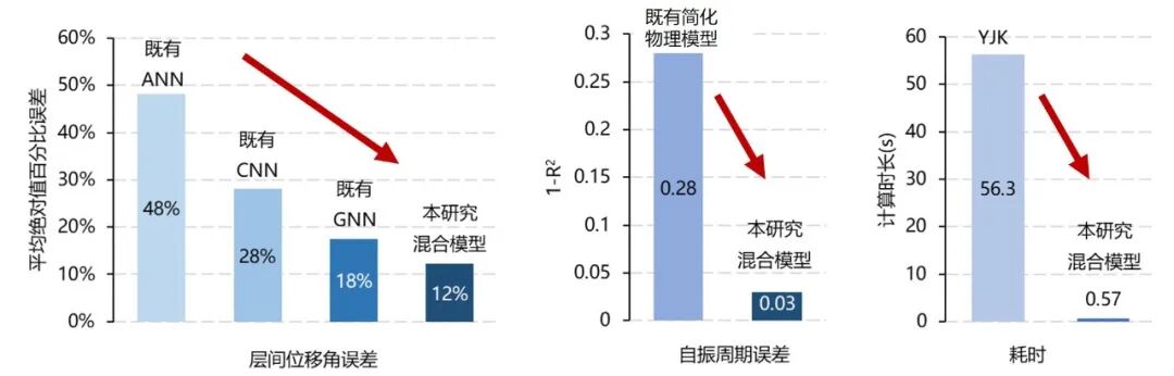 实验表明,本研究提出的混合模型对层间位移角、周期等的计算精度显著优于典型的纯数据驱动[1,3,4]、纯物理驱动[5]代理模型;计算效率比商业设计软件提高100倍,耗时仅不到1秒。可见,本研究有效地发挥了数据和物理模型各自的优势,更好地实现了效率和精度的平衡。