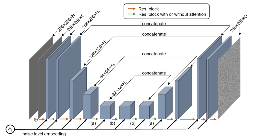 数据集构建方面使用了基于特征空间表示的硅基视觉大法,这里卖个关子,将在下回揭秘。在数据集构建完成后,我们选择如图7所示的带注意力机制和噪声等级编码的U-Net进行剪力墙生成任务。