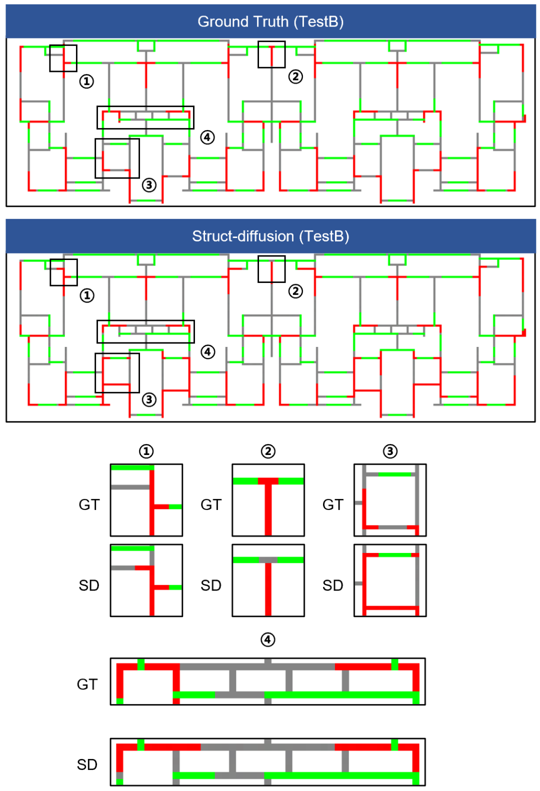 可以看出,扩散模型在该典型案例上表现良好,剪力墙布置的位置大致均正确,只在部分细节上略有不同。其中②③区域工程师布置更为合理,而①④区域的布置则需要根据实际情况判断。这说明扩散模型有良好的泛化性能,在不同设计院的案例中也有不错的表现。