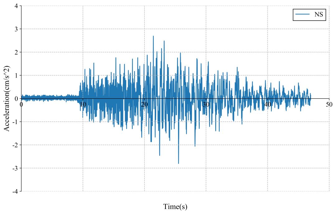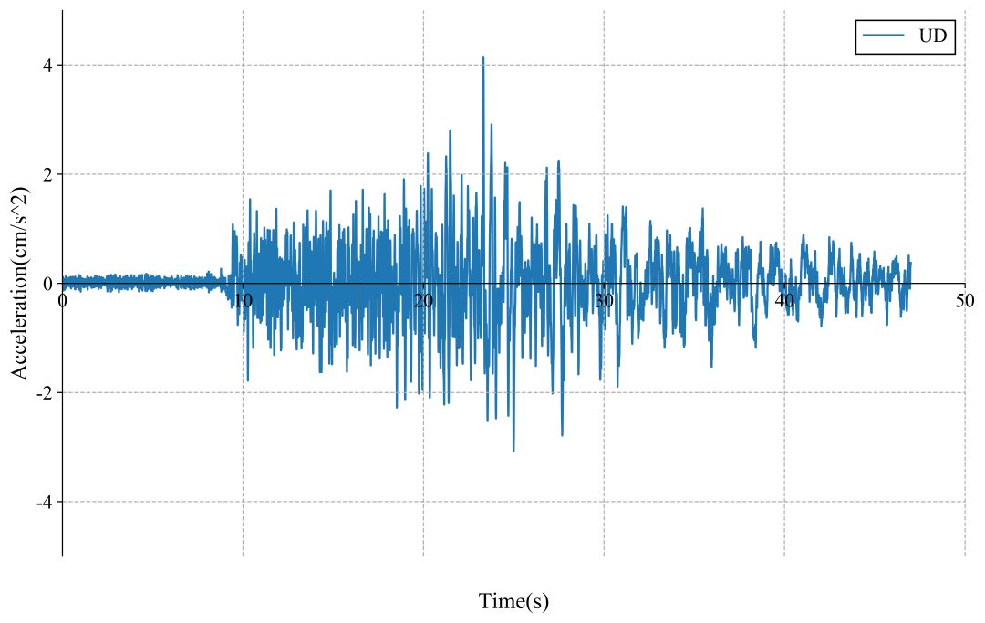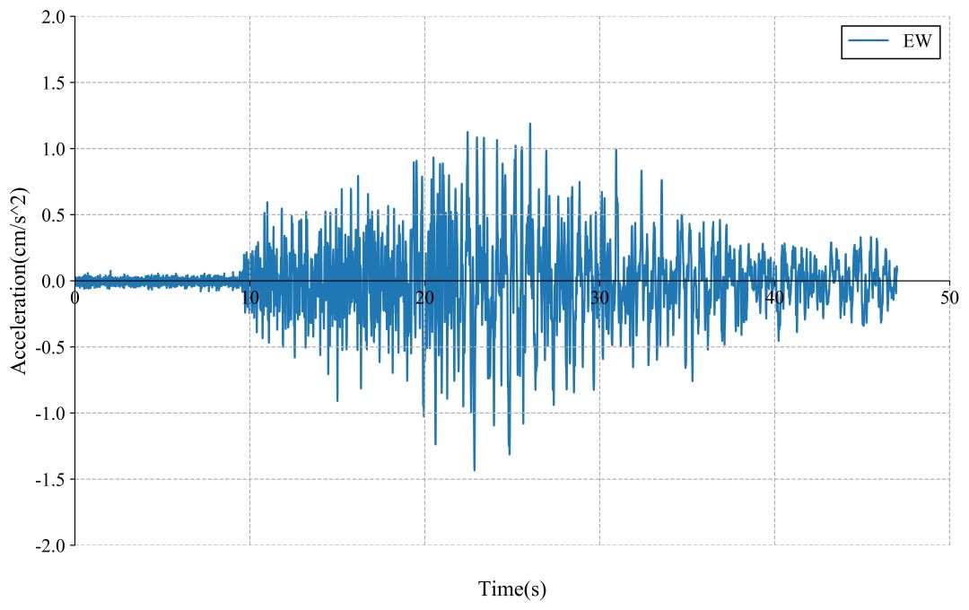 62YUM记录台站位置北纬39.79度,东经97.56度(图1),记录到水平向地震动峰值加速度为2.79cm/s2,竖直向地震动峰值加速度为4.07cm/s2。该地震动如图2、图3所示。