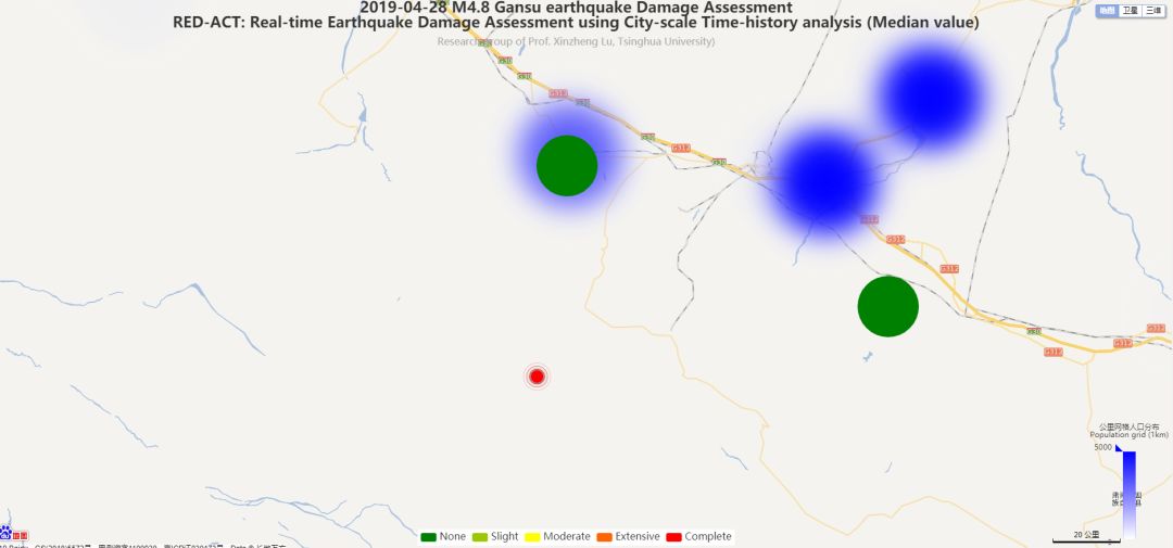 利用密布强震台网在震后获取的实时地震动信息,再结合城市抗震弹塑性分析,就可以得到地震发生后不同地点的建筑破坏情况,为抗震救灾决策提供科学支撑。图4为根据20190428甘肃省张掖市肃南县4.8级地震震中附近范围内台站记录分析得到的建筑震害分布示意图,图5为根据甘肃省张掖市肃南县4.8级地震震中附近范围内台站记录分析得到的人员加速度感受分布示意图。