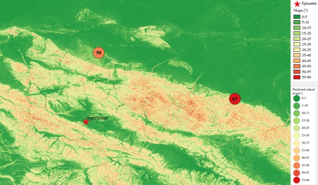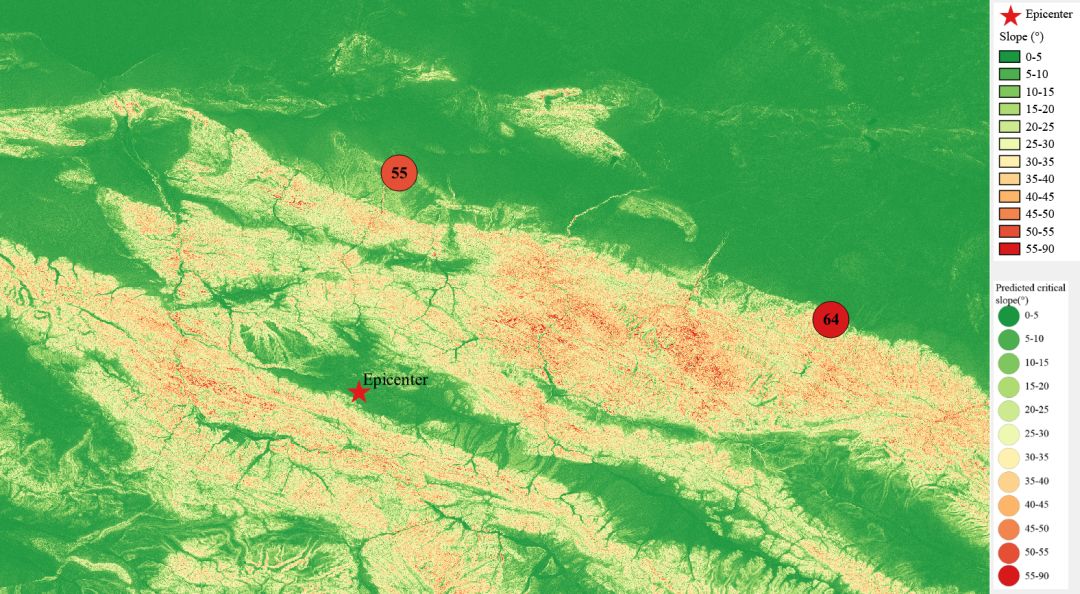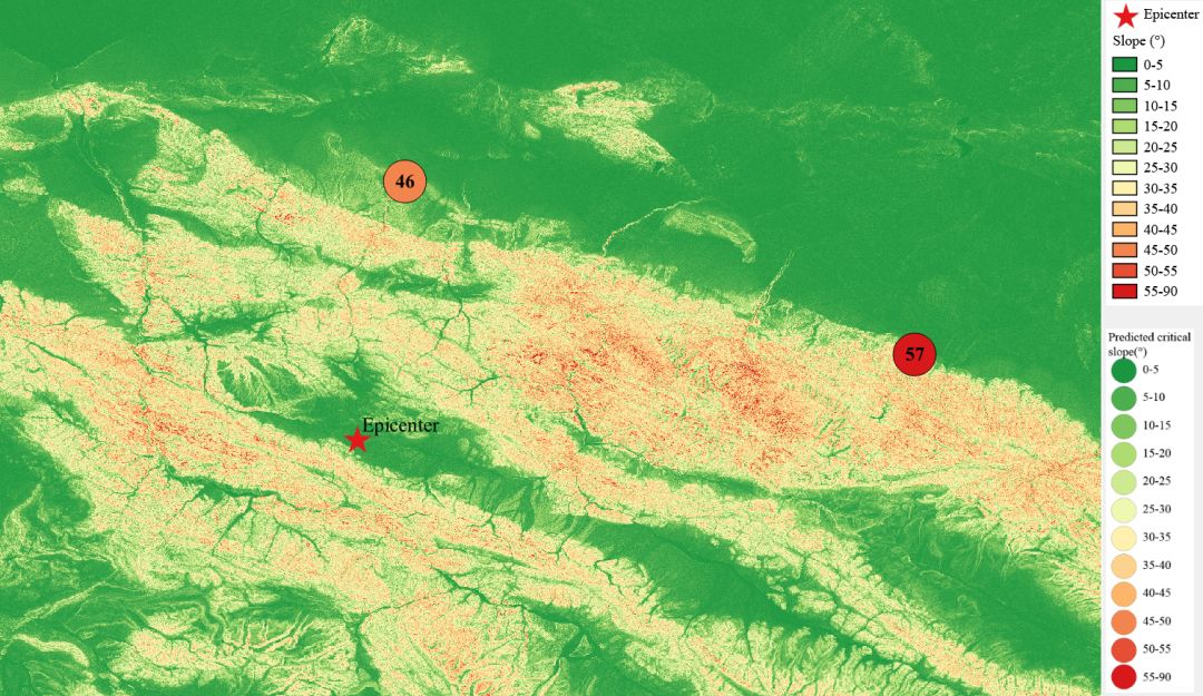 根据当地地形数据、岩性数据和实测地面运动记录,可以计算得到不同滑坡体饱和比例下的滑坡分布,如图6所示。其中,底图为当地坡度分布图,每个圆圈代表每个台站的计算结果,圆圈中的数字代表发生滑坡的临界坡度,台站附近坡度大于该数值的地方滑坡发生概率高。