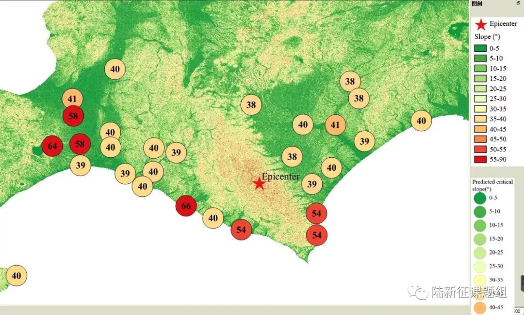 According to local topographic data, lithology data and ground motion records, the distribution of earthquake-induced landslide near to different stations under the different proportions of the landslide slab thickness that is saturated can be calculated, as shown in Figure 4. The basemap shows the distribution of the local slope. The number in the circle represents the critical slope of the landslide. The earthquake-induced landslide tends to occur with a higher probability when the slope is larger than this threshold value.