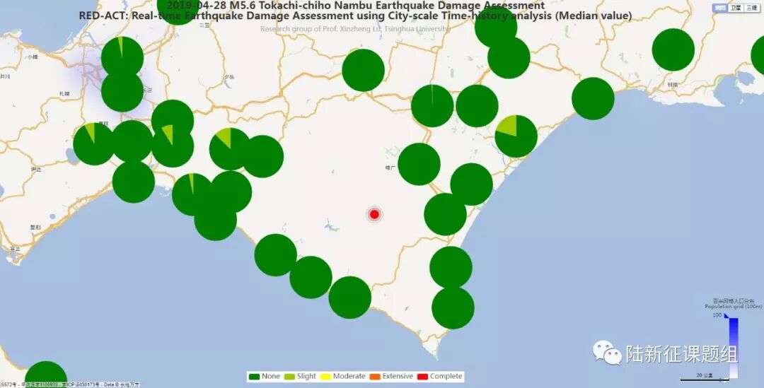Using the real-time ground motions obtained from the strong motion networks and the city-scale nonlinear time-history analysis (see the Appendix of this report), the damage ratios of buildings located in different places can be obtained. The building damage distribution and the human uncomfortableness distribution near to different stations is shown in Figure 2 and Figure 3, respectively. These outcomes can provide a reference for post-earthquake rescue work.