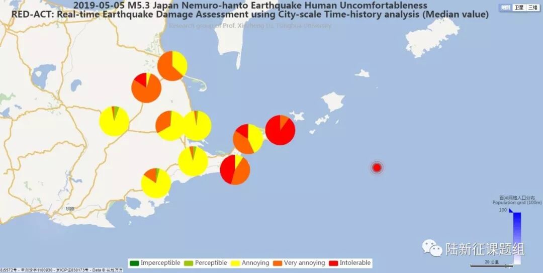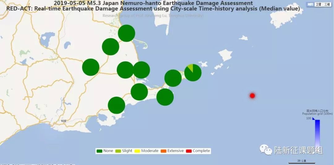 Using the real-time ground motions obtained from the strong motion networks and the city-scale nonlinear time-history analysis (see the Appendix of this report), the damage ratios of buildings located in different places can be obtained. The building damage distribution and the human uncomfortableness distribution near to different stations is shown in Figure 2 and Figure 3, respectively. These outcomes can provide a reference for post-earthquake rescue work.
