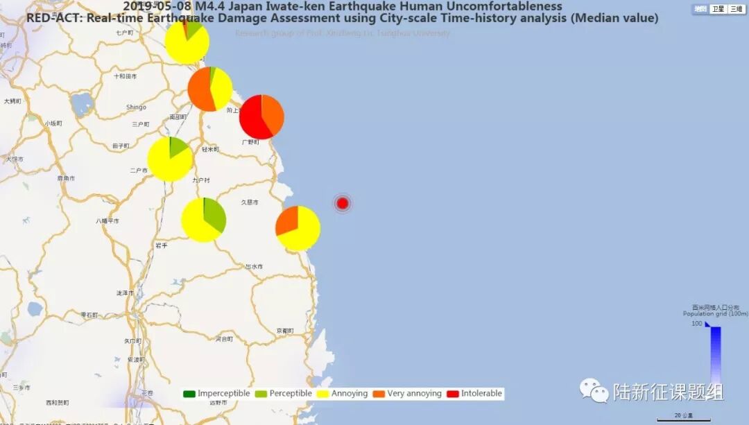 Using the real-time ground motions obtained from the strong motion networks and the city-scale nonlinear time-history analysis (see the Appendix of this report), the damage ratios of buildings located in different places can be obtained. The building damage distribution and the human uncomfortableness distribution near to different stations is shown in Figure 2 and Figure 3, respectively. These outcomes can provide a reference for post-earthquake rescue work.