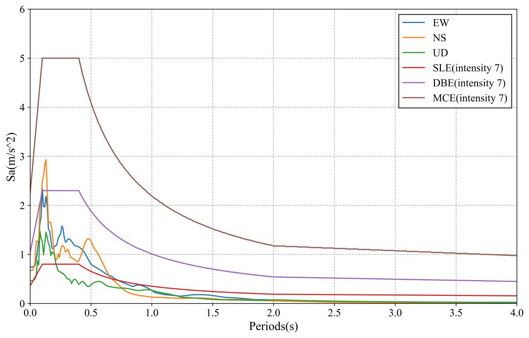 STYH台站位置为北纬23.179度,东经120.781度(图1),记录到水平向地震动峰值加速度为74.26cm/s2,竖直向地震动峰值加速度为46.13cm/s2。该地震动及反应谱如图2、图3所示。