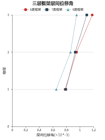 将STYH台站记录输入立面布置如图7 (a)所示的6度、7度和8度设防的典型三层钢筋混凝土框架结构,得到其层间位移角包络如图7 (b)所示。