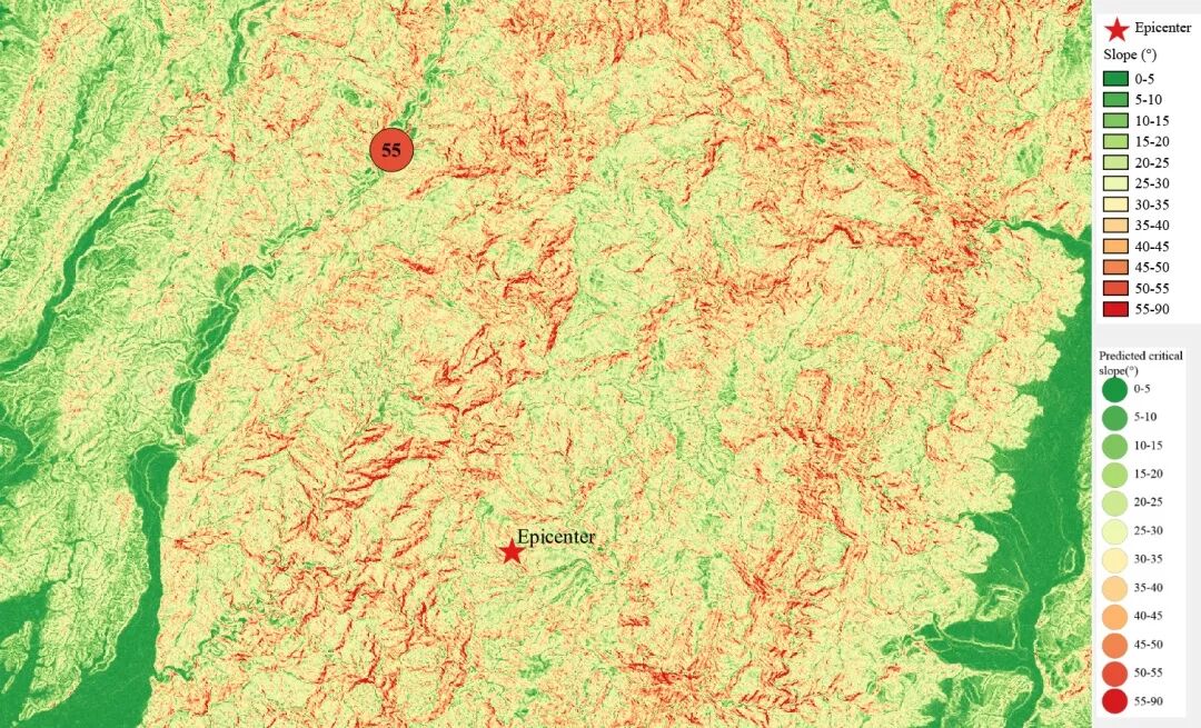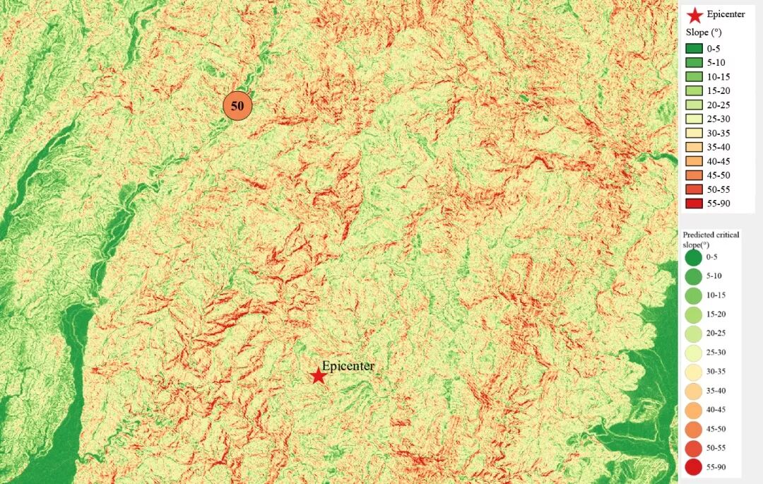 根据当地地形数据、岩性数据和实测地面运动记录,可以计算得到不同滑坡体饱和比例下的滑坡分布,如图10所示。其中,底图为当地坡度分布图,每个圆圈代表每个台站的计算结果,圆圈中的数字代表发生滑坡的临界坡度,台站附近坡度大于该数值的地方滑坡发生概率高。