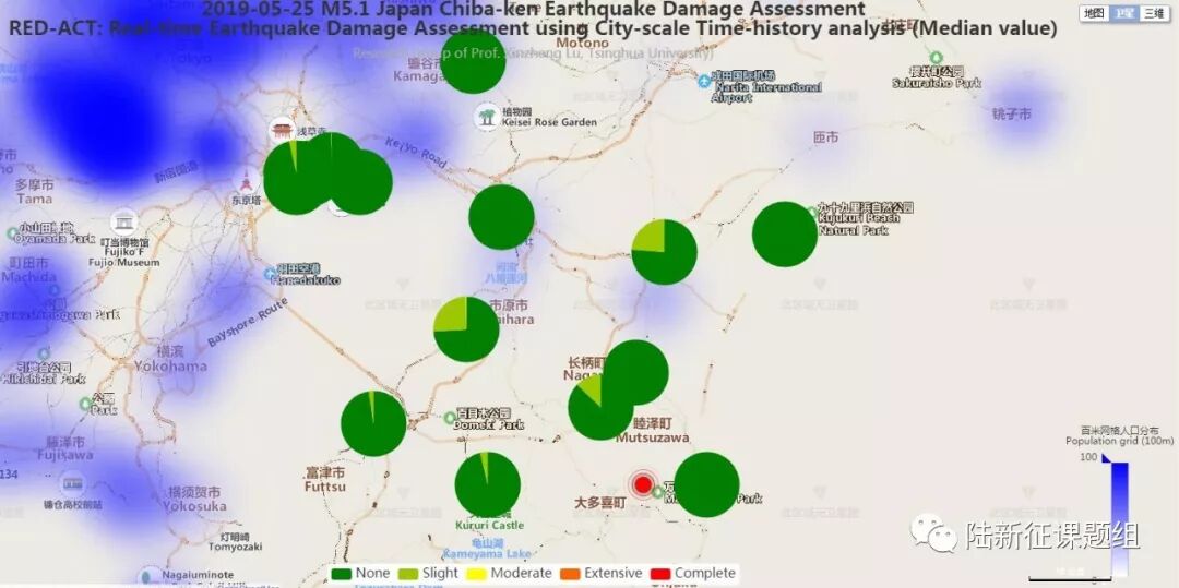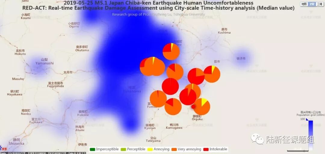Using the real-time ground motions obtained from the strong motion networks and the city-scale nonlinear time-history analysis (see the Appendix of this report), the damage ratios of buildings located in different places can be obtained. The building damage distribution and the human uncomfortableness distribution near to different stations is shown in Figure 2 and Figure 3, respectively. These outcomes can provide a reference for post-earthquake rescue work.