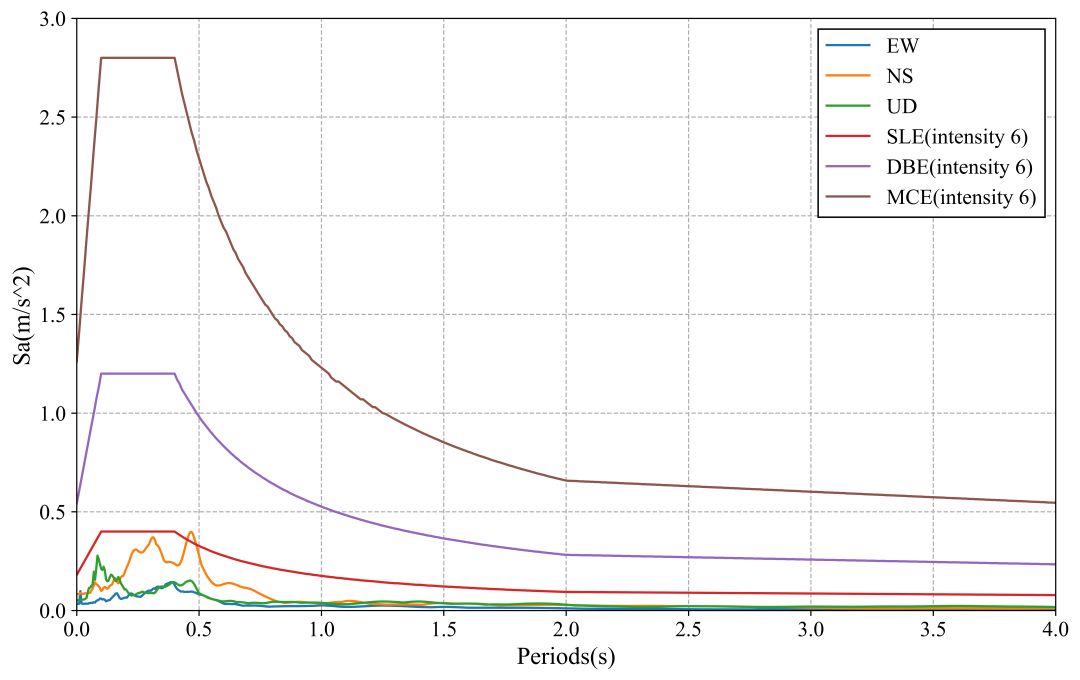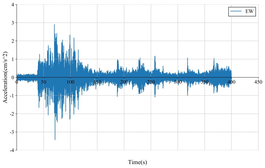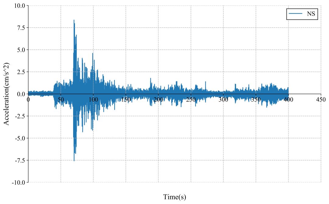 35SST记录台站位置北纬24.74度,东经118.63度(图1),记录到水平向地震动峰值加速度为8.32cm/s2,竖直向地震动峰值加速度为5.18cm/s2。该地震动如图2、图3所示。