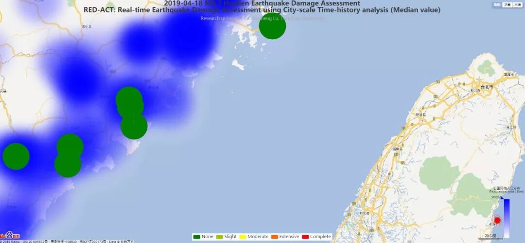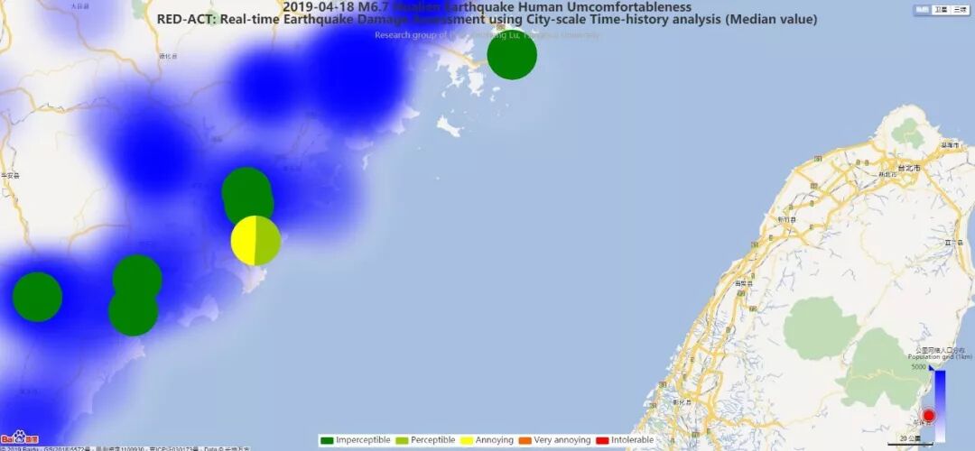利用密布强震台网在震后获取的实时地震动信息,再结合城市抗震弹塑性分析,就可以得到地震发生后不同地点的建筑破坏情况,为抗震救灾决策提供科学支撑。图4为根据20190418台湾花莲县6.7级地震震中附近范围内台站记录分析得到的建筑震害分布示意图,图5为根据20190418台湾花莲县6.7级地震震中附近范围内台站记录分析得到的人员加速度感受分布示意图。