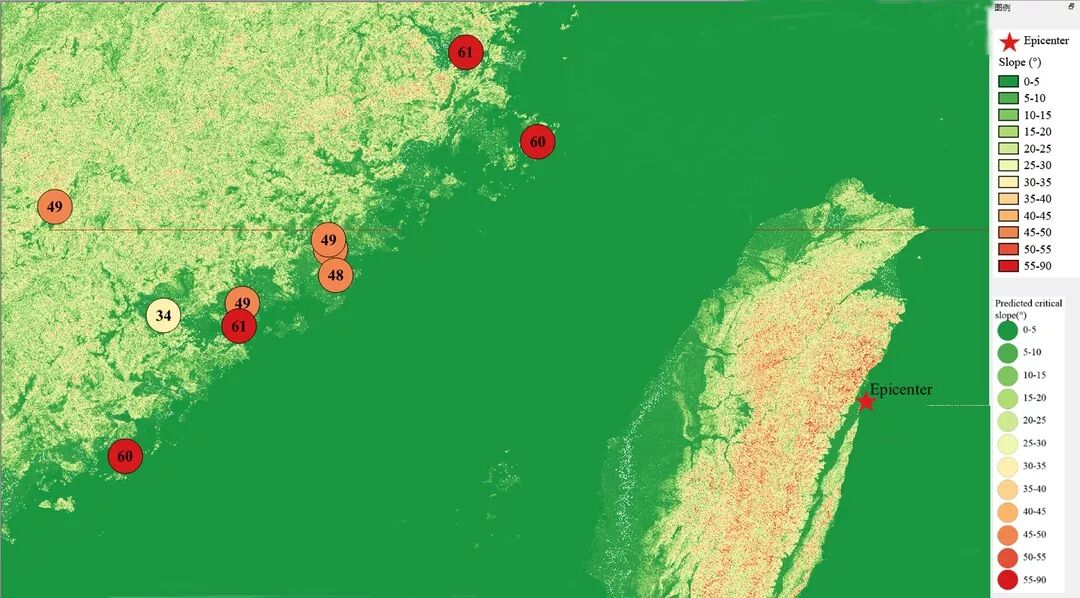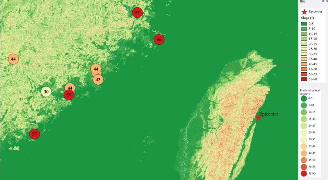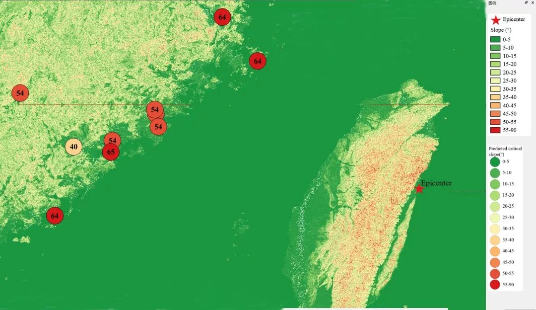 根据当地地形数据、岩性数据和实测地面运动记录,可以计算得到不同滑坡体饱和比例下的滑坡分布,如图6所示。其中,底图为当地坡度分布图,每个圆圈代表每个台站的计算结果,圆圈中的数字代表发生滑坡的临界坡度,台站附近坡度大于该数值的地方滑坡发生概率高。