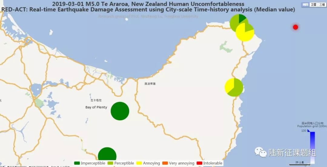 Using the real-time ground motions obtained from the strong motion networks and the city-scale nonlinear time-history analysis (see the Appendix of this report), the damage ratios of buildings located in different places can be obtained. The building damage distribution and the human uncomfortableness distribution near to different stations is shown in Figure 2 and Figure 3, respectively. These outcomes can provide a reference for post-earthquake rescue work.