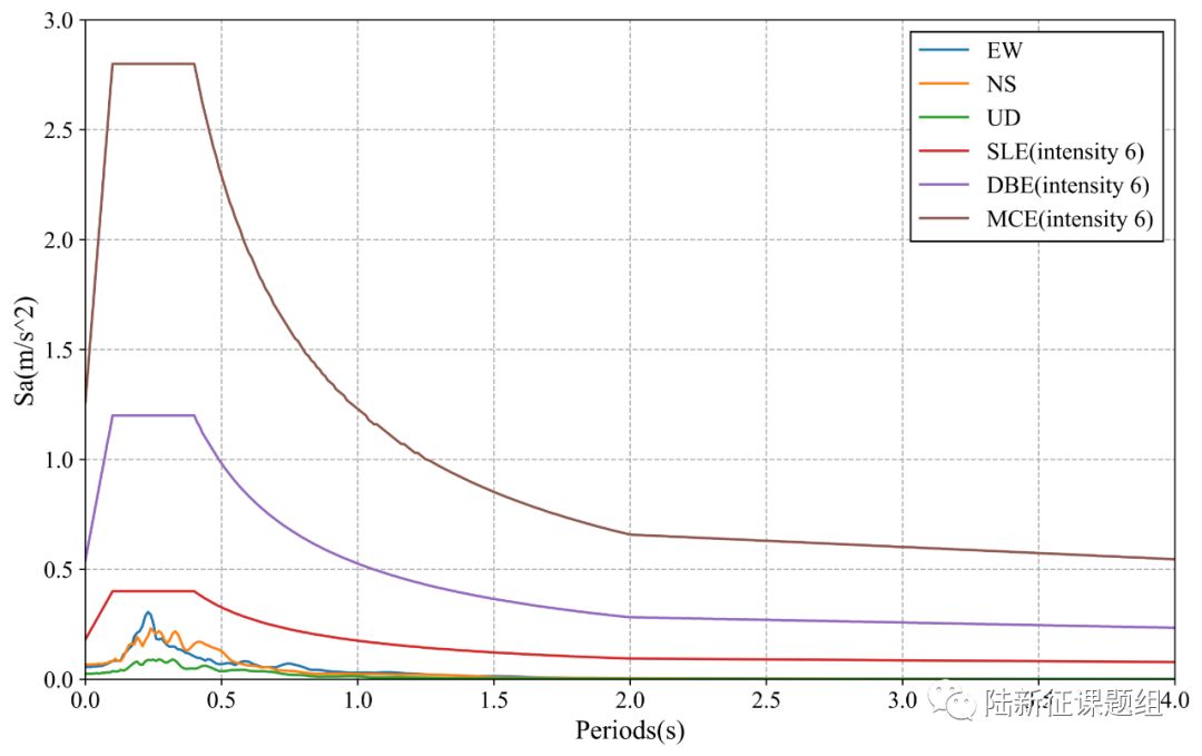 6 ground motions near to epicenter of this earthquake were analyzed. The names and locations of the stations can be found Table 1. The maximal recorded peak ground acceleration (PGA) is 6.7 cm/s/s. The corresponding response spectra in comparison with the design spectra specified in the Chinese Code for Seismic Design of Buildings are shown in Figure 1.