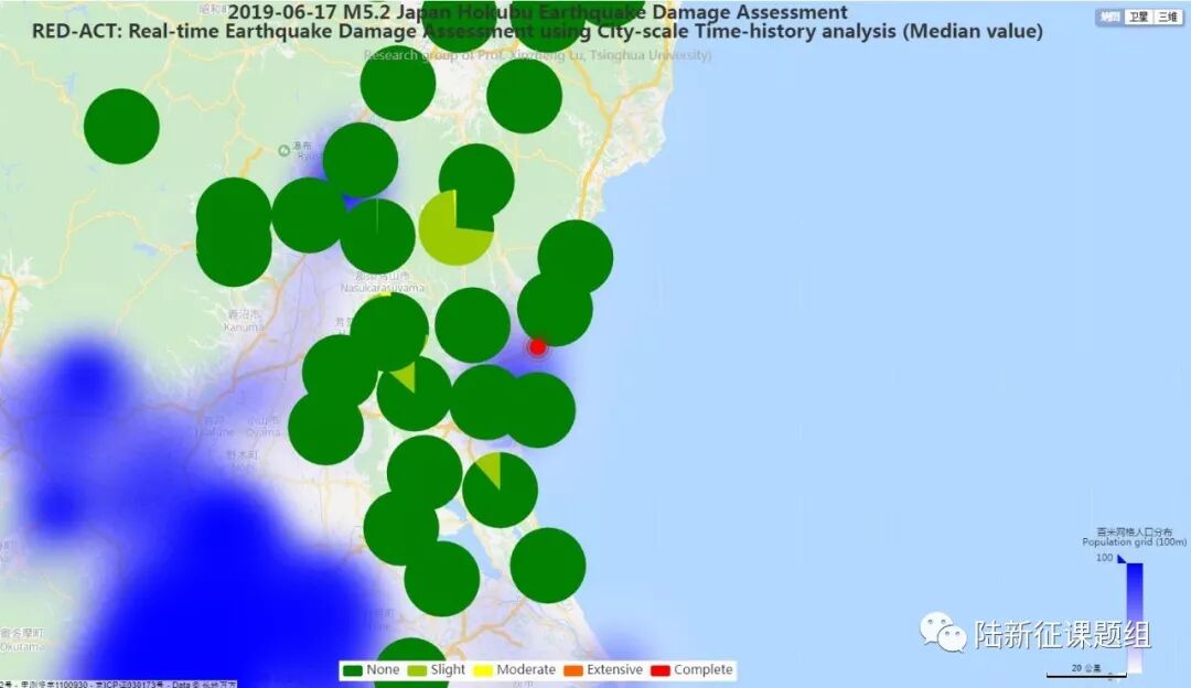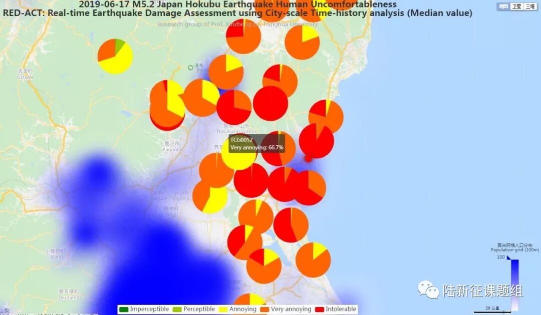 Using the real-time ground motions obtained from the strong motion networks and the city-scale nonlinear time-history analysis (see the Appendix of this report), the damage ratios of buildings located in different places can be obtained. The building damage distribution and the human uncomfortableness distribution near to different stations is shown in Figure 2 and Figure 3, respectively. These outcomes can provide a reference for post-earthquake rescue work.
