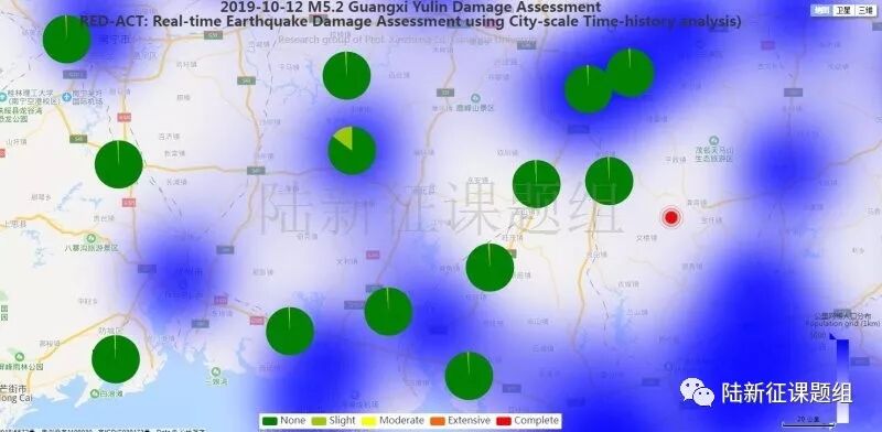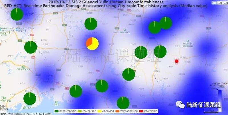 利用密布强震台网在震后获取的实时地震动信息,再结合城市抗震弹塑性分析,就可以得到地震发生后不同地点的建筑破坏情况,为抗震救灾决策提供科学支撑。图3为根据 20191012广西玉林市北流市5.2级地震震中附近范围内台站记录分析得到的建筑震害分布示意图。图4为根据 20191012广西玉林市北流市5.2级地震震中附近范围内台站记录分析得到的人员加速度感受分布示意图。