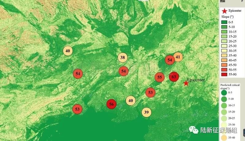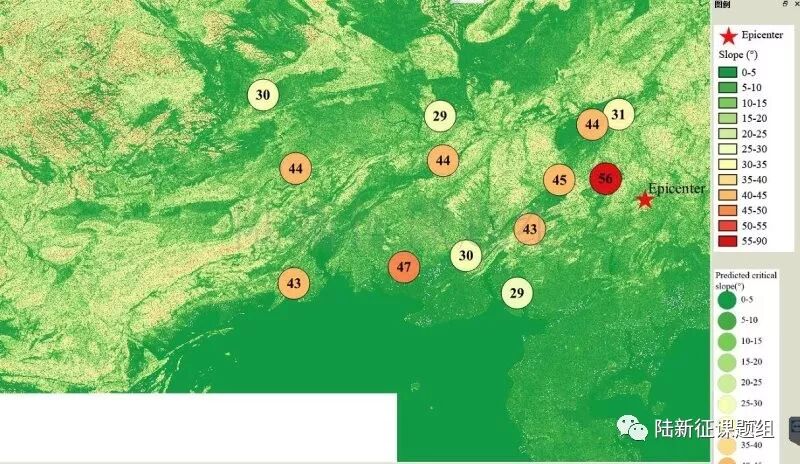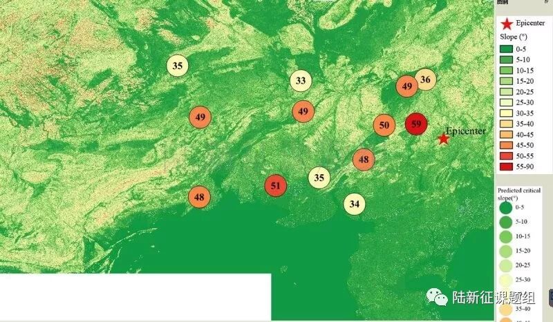 根据当地地形数据、岩性数据和实测地面运动记录,可以计算得到不同滑坡体饱和比例下的滑坡分布,如图5所示。其中,底图为当地坡度分布图,每个圆圈代表每个台站的计算结果,圆圈中的数字代表发生滑坡的临界坡度,台站附近坡度大于该数值的地方滑坡发生概率高。