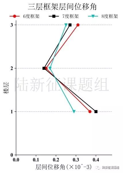 将45LCC台站记录输入立面布置如图6(a)所示的6度、7度和8度设防的典型三层钢筋混凝土框架结构,得到其层间位移角包络如图6(b)所示。