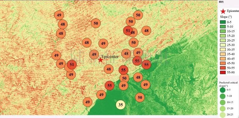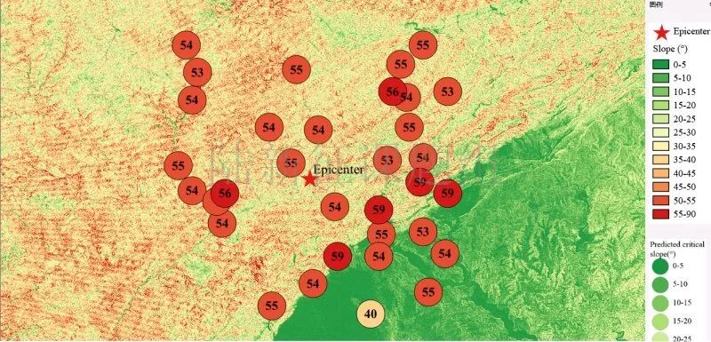 根据当地地形数据、岩性数据和实测地面运动记录,可以计算得到不同滑坡体饱和比例下的滑坡分布,如图6所示。其中,底图为当地坡度分布图,每个圆圈代表每个台站的计算结果,圆圈中的数字代表发生滑坡的临界坡度,台站附近坡度大于该数值的地方滑坡发生概率高。
