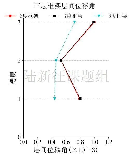 将典型台站记录输入立面布置如图7 (a)所示的6度、7度和8度设防的典型三层钢筋混凝土框架结构,得到其层间位移角包络如图7 (b)所示。