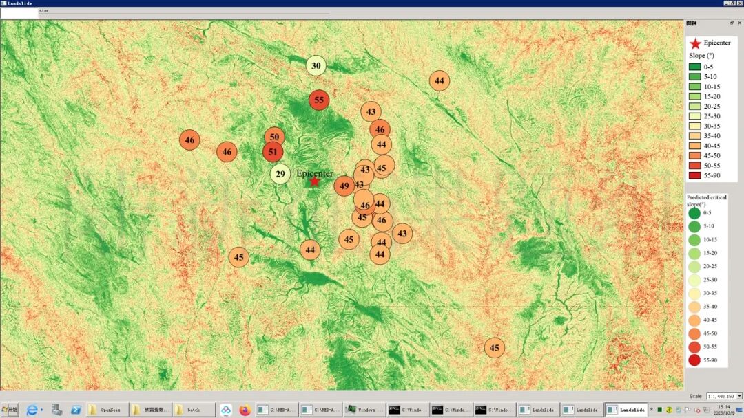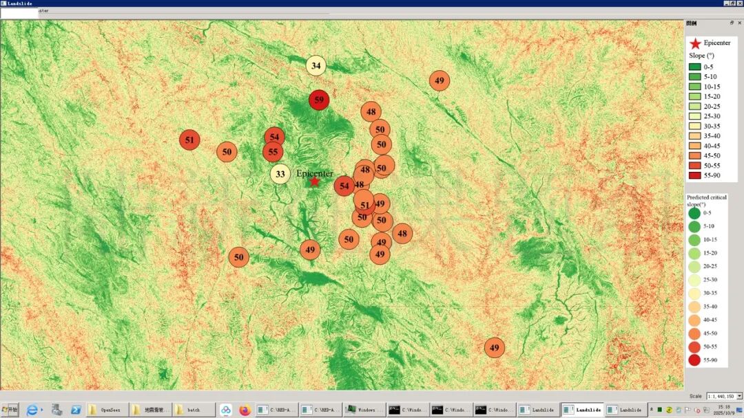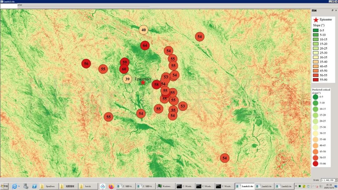 根据当地地形数据、岩性数据和实测地面运动记录,可以计算得到不同滑坡体饱和比例下的滑坡分布,如图5所示。其中,底图为当地坡度分布图,每个圆圈代表每个台站的计算结果,圆圈中的数字代表发生滑坡的临界坡度,台站附近坡度大于该数值的地方滑坡发生概率高。