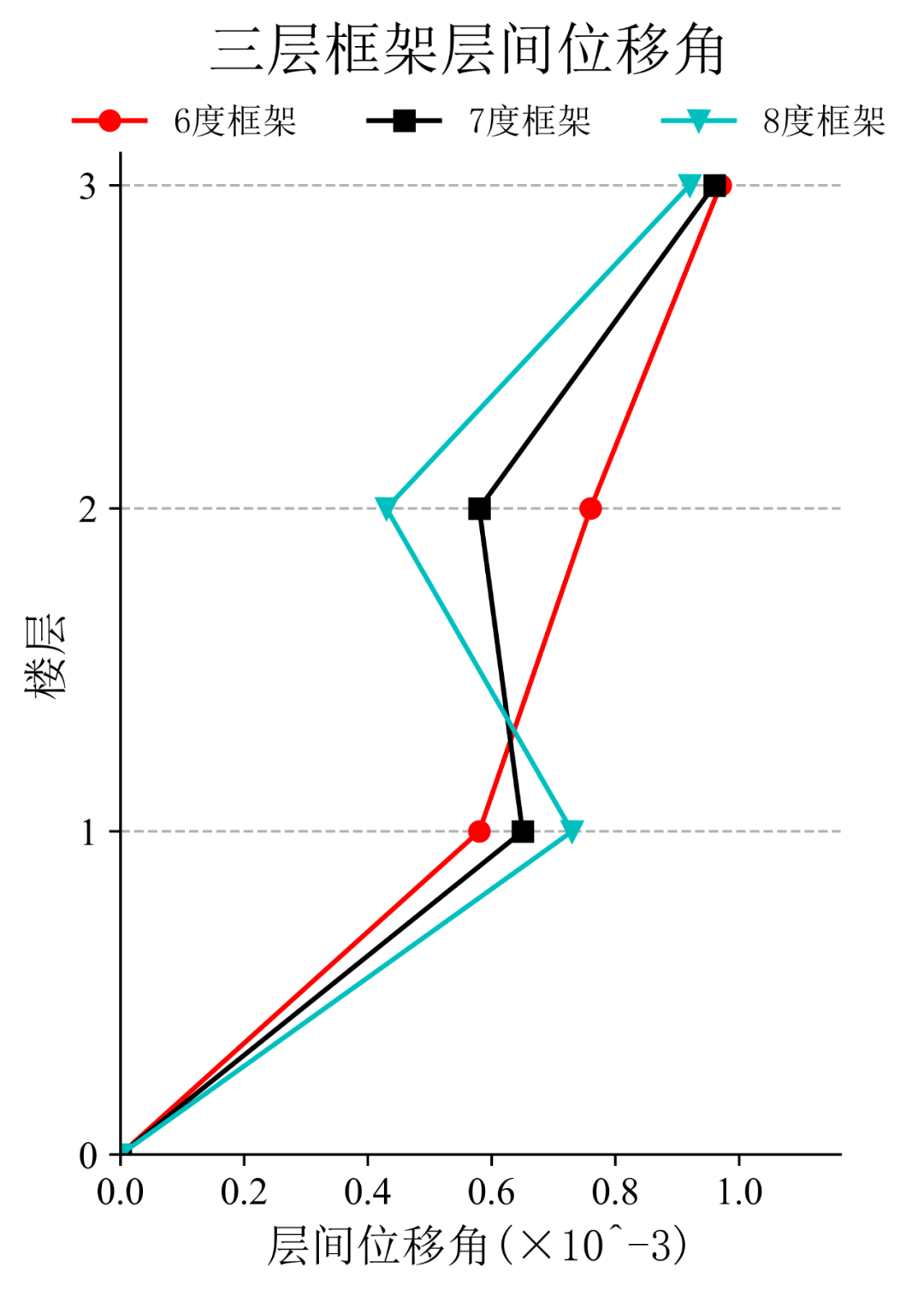 将典型台站记录输入立面布置如图6(a)所示的6度、7度和8度设防的典型三层钢筋混凝土框架结构,得到其层间位移角包络如图6(b)所示。