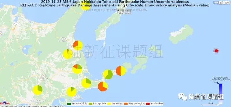 Using the real-time ground motions obtained from the strong motion networks and the city-scale nonlinear time-history analysis, the damage ratios of buildings located in different places can be obtained. The building damage distribution and the human feeling distribution near to different stations are shown in Figure 2 and Figure 3, respectively. These outcomes can provide a reference for post-earthquake rescue work
