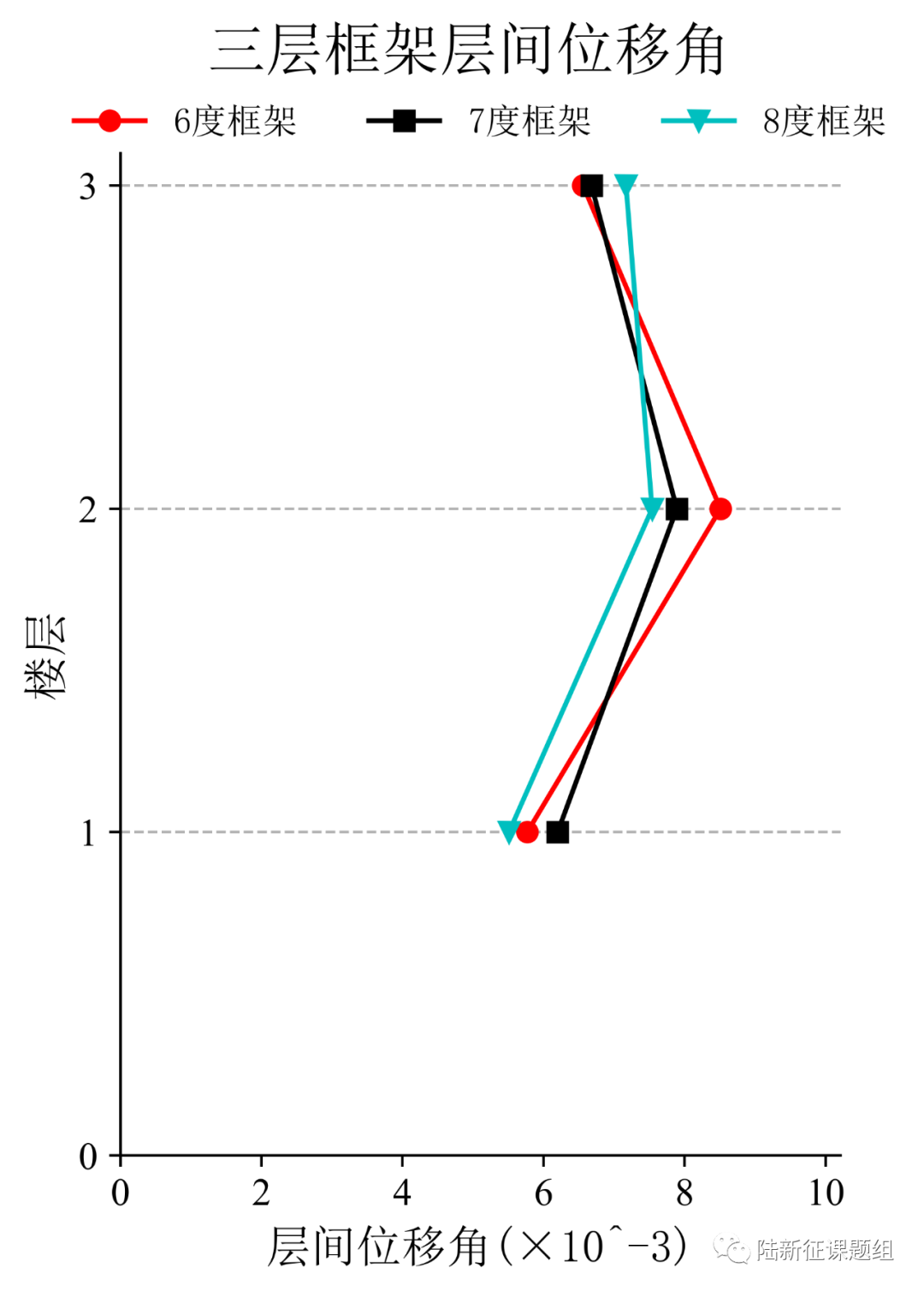 将典型台站记录输入立面布置如图5(a)所示的6度、7度和8度设防的典型三层钢筋混凝土框架结构,得到其层间位移角包络如图5(b)所示。