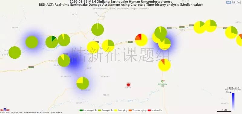 利用密布强震台网在震后获取的实时地震动信息,再结合城市抗震弹塑性分析,就可以得到地震发生后不同地点的建筑破坏情况,为抗震救灾决策提供科学支撑。图4为根据20200116新疆阿克苏地区库车县5.6级地震震中附近范围内台站记录分析得到的建筑震害分布示意图。图5为根据20200116新疆阿克苏地区库车县5.6级地震震中附近范围内台站记录分析得到的人员加速度感受分布示意图。