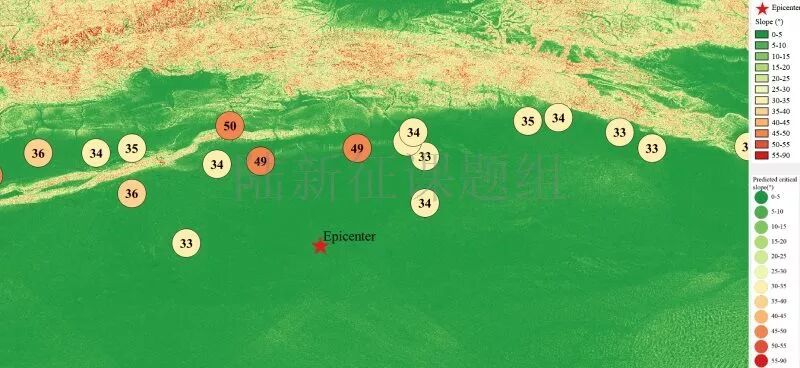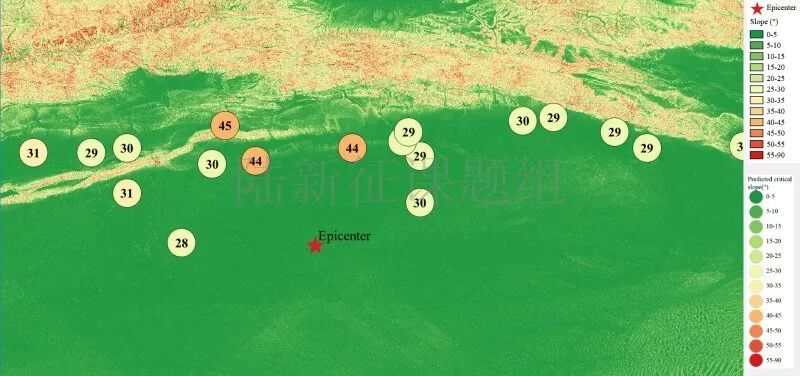根据当地地形数据、岩性数据和实测地面运动记录,可以计算得到不同滑坡体饱和比例下的滑坡分布,如图6所示。其中,底图为当地坡度分布图,每个圆圈代表每个台站的计算结果,圆圈中的数字代表发生滑坡的临界坡度,台站附近坡度大于该数值的地方滑坡发生概率高。