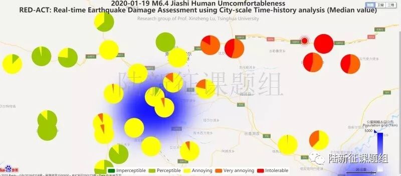 利用密布强震台网在震后获取的实时地震动信息,再结合城市抗震弹塑性分析,就可以得到地震发生后不同地点的建筑破坏情况,为抗震救灾决策提供科学支撑。图3为根据20200119新疆喀什伽师县6.4级地震震中附近范围内台站记录分析得到的建筑震害分布示意图。图4为根据20200119新疆喀什伽师县6.4级地震震中附近范围内台站记录分析得到的人员加速度感受分布示意图。