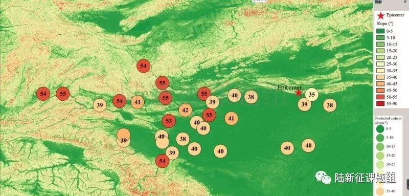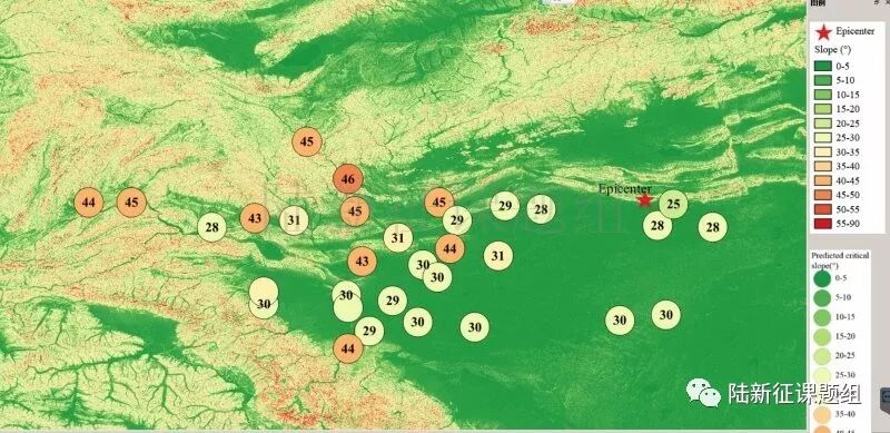 根据当地地形数据、岩性数据和实测地面运动记录,可以计算得到不同滑坡体饱和比例下的滑坡分布,如图5所示。其中,底图为当地坡度分布图,每个圆圈代表每个台站的计算结果,圆圈中的数字代表发生滑坡的临界坡度,台站附近坡度大于该数值的地方滑坡发生概率高。