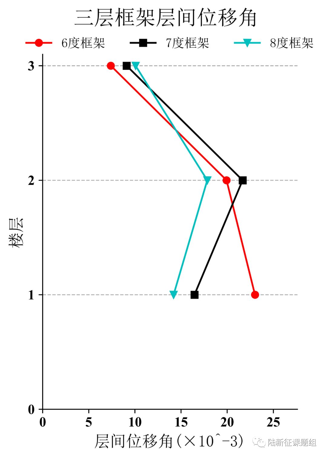 将65XKR台站记录输入立面布置如图6 (a)所示的6度、7度和8度设防的典型三层钢筋混凝土框架结构,得到其层间位移角包络如图6 (b)所示。
