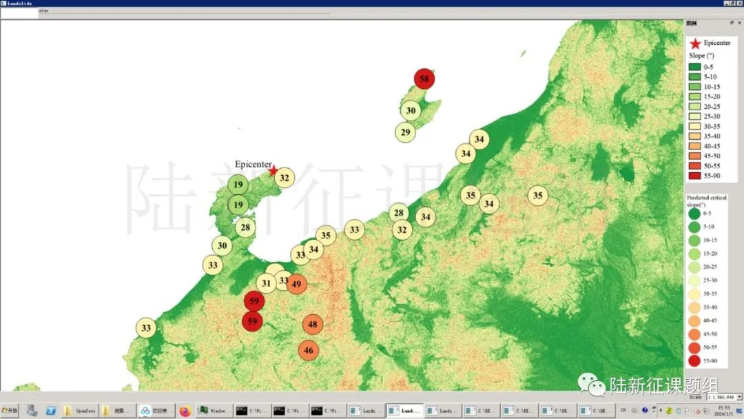 根据当地地形数据、岩性数据和实测地面运动记录,可以计算得到不同滑坡体饱和比例下的滑坡分布,如图5所示。其中,底图为当地坡度分布图,每个圆圈代表每个台站的计算结果,圆圈中的数字代表发生滑坡的临界坡度,台站附近坡度大于该数值的地方滑坡发生概率高。