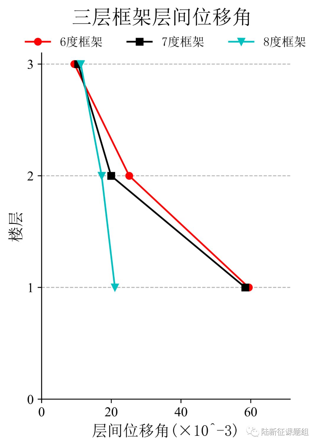 将典型台站记录输入立面布置如图6(a)所示的6度、7度和8度设防的典型三层钢筋混凝土框架结构,得到其层间位移角包络如图6(b)所示。