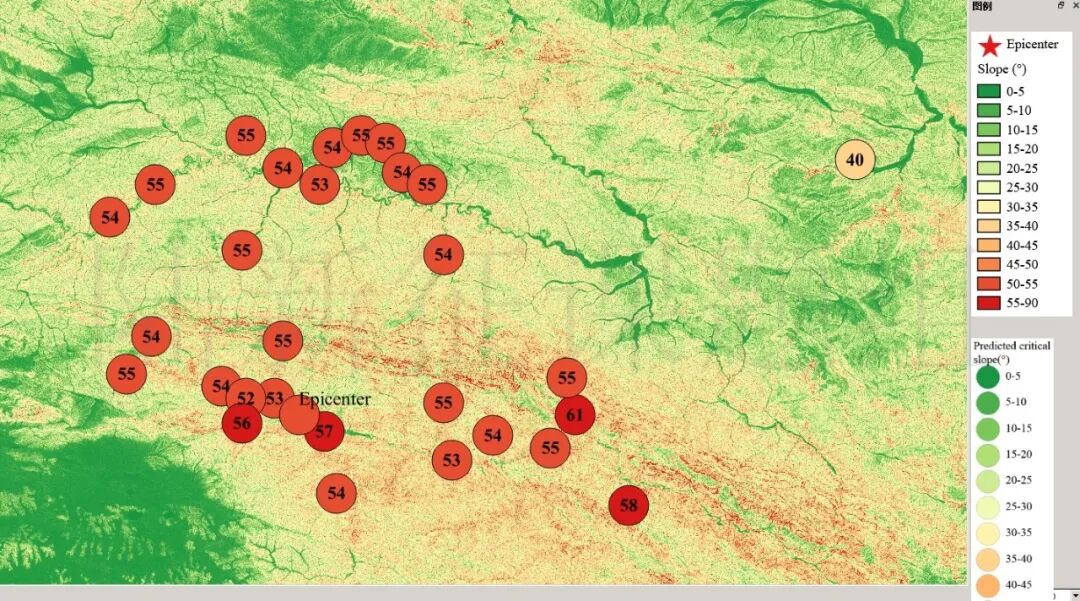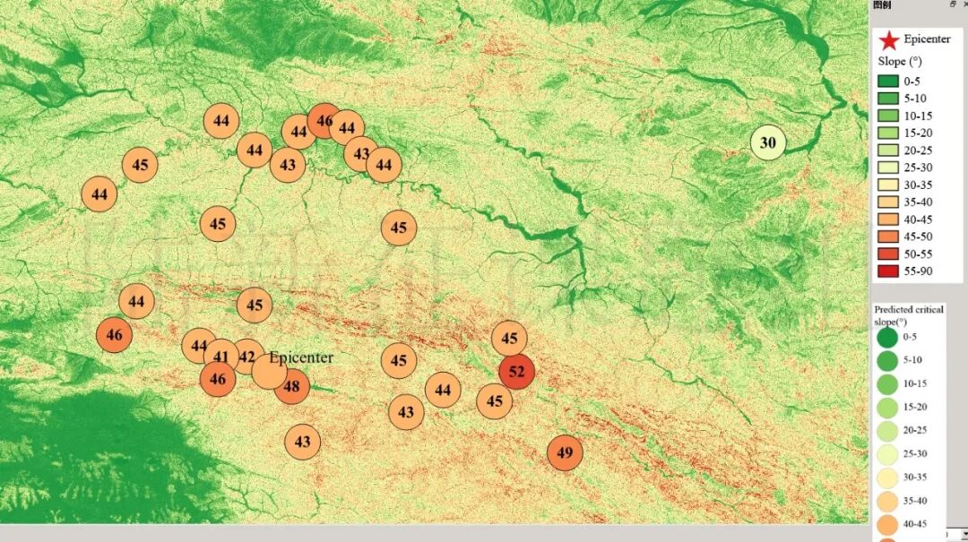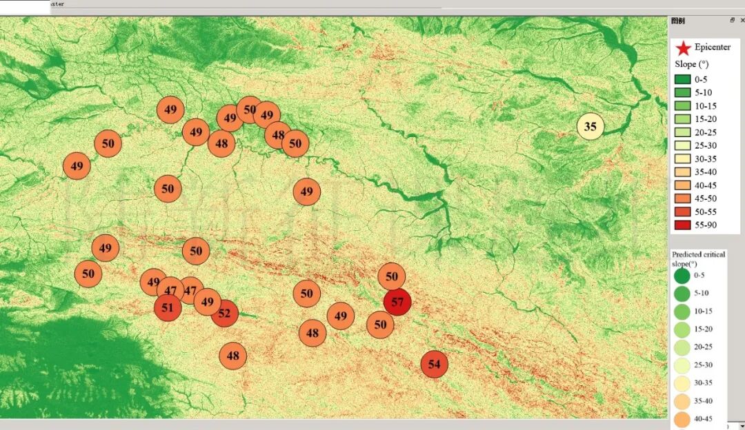 根据当地地形数据、岩性数据和实测地面运动记录,可以计算得到不同滑坡体饱和比例下的滑坡分布,如图5所示。其中,底图为当地坡度分布图,每个圆圈代表每个台站的计算结果,圆圈中的数字代表发生滑坡的临界坡度,台站附近坡度大于该数值的地方滑坡发生概率高。