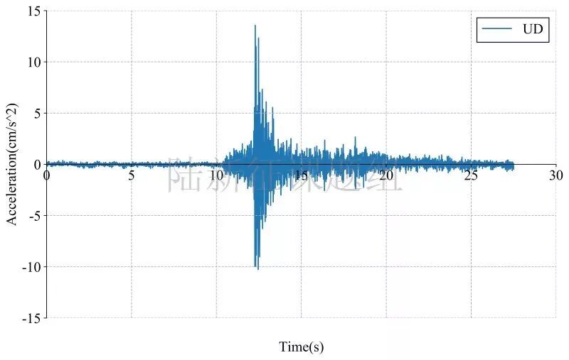 HEG0083记录台站位置北纬39.89度,东经115.33度(图1,其中红色标记为震中位置),记录到水平向地震动峰值加速度为24.59cm/s/s,竖直向地震动峰值加速度为13.54cm/s/s。该地震动如图2、图3所示。