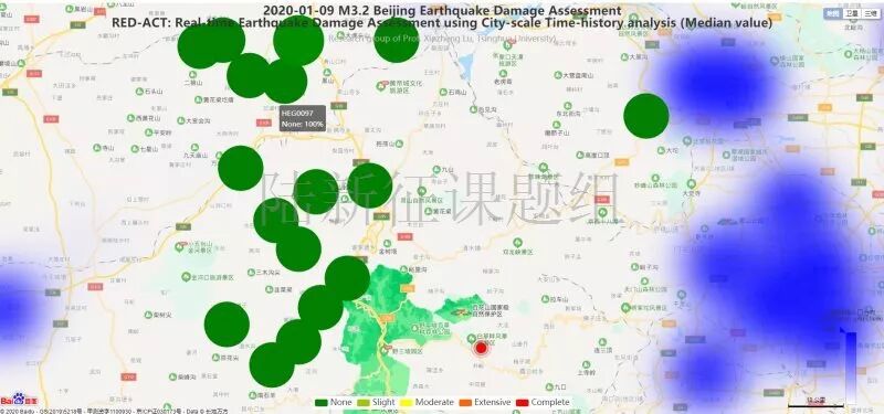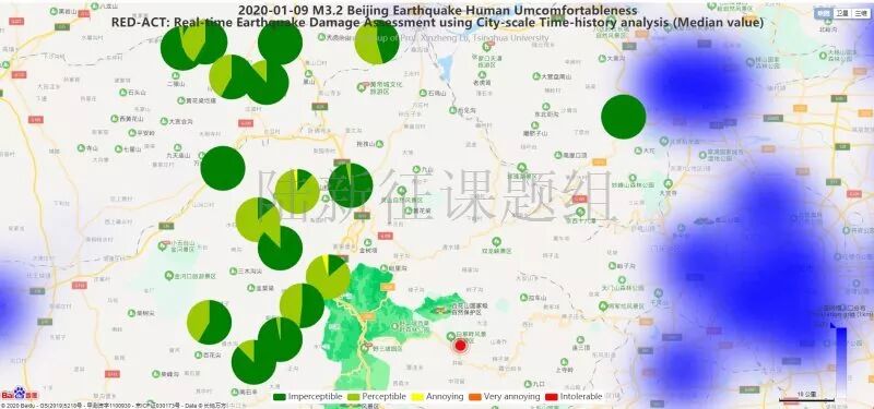 利用密布强震台网在震后获取的实时地震动信息,再结合城市抗震弹塑性分析,就可以得到地震发生后不同地点的建筑破坏情况,为抗震救灾决策提供科学支撑。图4为根据 20200109北京市房山区3.2级地震震中附近范围内台站记录分析得到的建筑震害分布示意图。图5为根据 20200109北京市房山区3.2级地震震中附近范围内台站记录分析得到的人员加速度感受分布示意图。