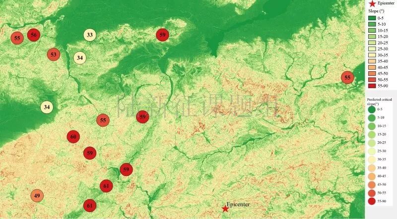根据当地地形数据、岩性数据和实测地面运动记录,可以计算得到不同滑坡体饱和比例下的滑坡分布,如图6所示。其中,底图为当地坡度分布图,每个圆圈代表每个台站的计算结果,圆圈中的数字代表发生滑坡的临界坡度,台站附近坡度大于该数值的地方滑坡发生概率高。