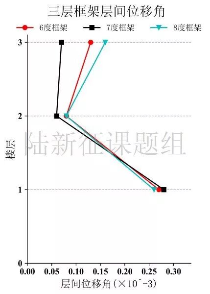 将HEG0083台站记录输入立面布置如图7 (a)所示的6度、7度和8度设防的典型三层钢筋混凝土框架结构,得到其层间位移角包络如图7 (b)所示。