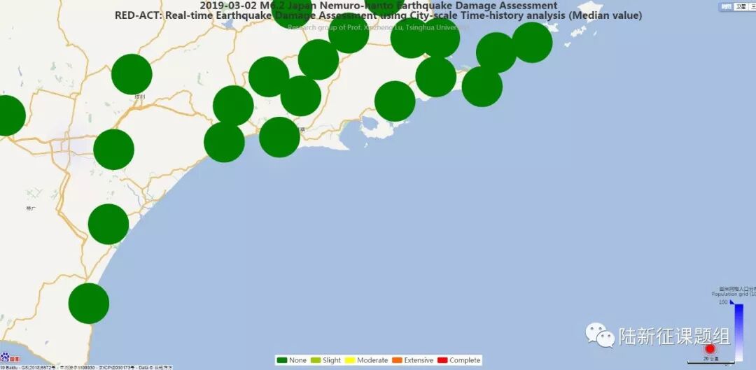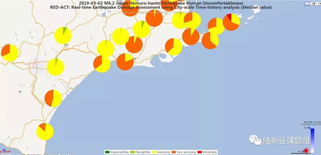 利用密布强震台网在震后获取的实时地震动信息,再结合城市抗震弹塑性分析(技术细节参见本报告附录),就可以得到地震发生后不同地点的建筑破坏情况,为抗震救灾决策提供科学支撑。图2为本次地震震中附近范围内台站记录分析得到的建筑震害分布示意图,图3为本次地震震中附近范围内台站记录分析得到的人员加速度感受分布示意图。图中蓝色云图为周围人口密度分布。