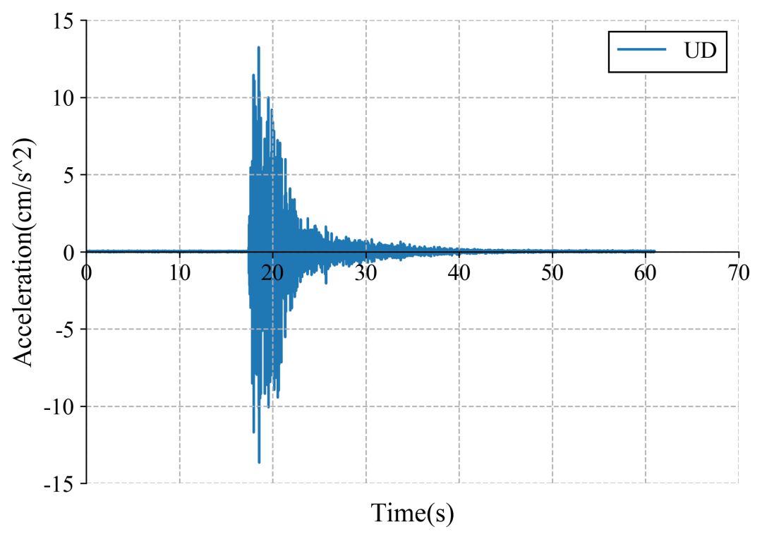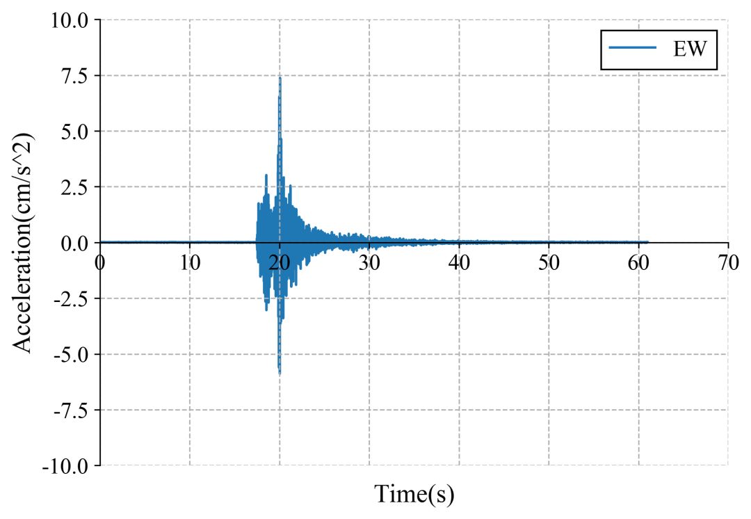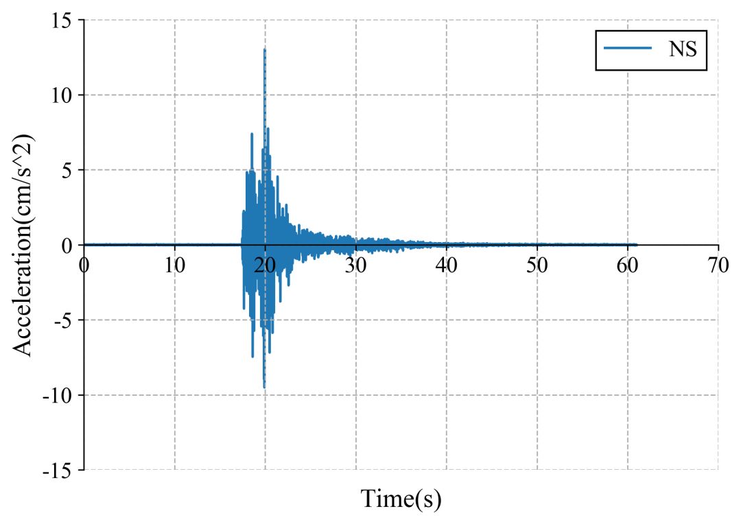 63ZMS记录台站位置北纬38.21度,东经100.05度(图1),记录到水平向地震动峰值加速度为13.0cm/s2,竖直向地震动峰值加速度为13.7cm/s2。该地震动如图2、图3所示。