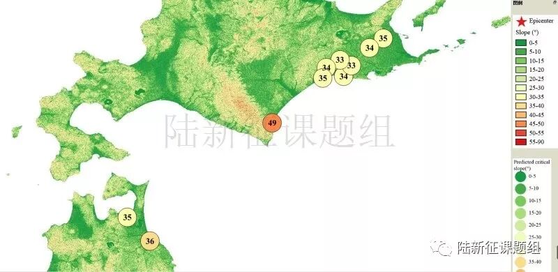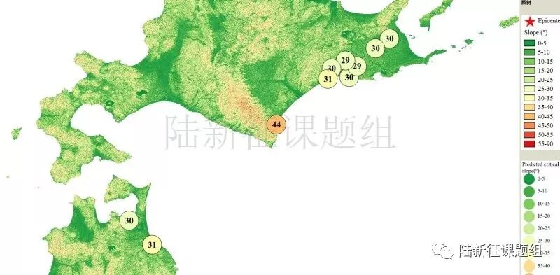 根据当地地形数据、岩性数据和实测地面运动记录,可以计算得到不同滑坡体饱和比例下的滑坡分布,如图5所示。其中,底图为当地坡度分布图,每个圆圈代表每个台站的计算结果,圆圈中的数字代表发生滑坡的临界坡度,台站附近坡度大于该数值的地方滑坡发生概率高。