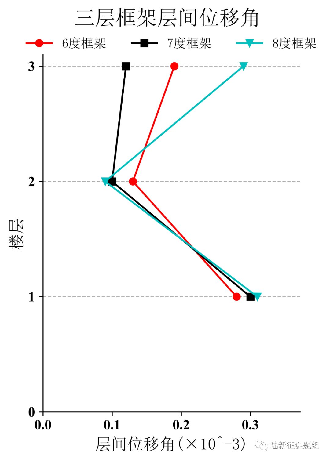 将HKD072台站记录输入立面布置如图6 (a)所示的6度、7度和8度设防的典型三层钢筋混凝土框架结构,得到其层间位移角包络如图6 (b)所示。