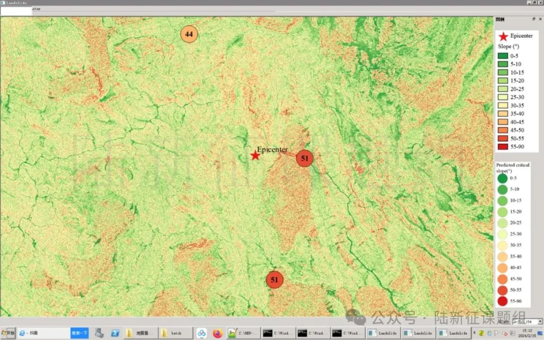 根据当地地形数据、岩性数据和实测地面运动记录,可以计算得到不同滑坡体饱和比例下的滑坡分布,如图5所示。其中,底图为当地坡度分布图,每个圆圈代表每个台站的计算结果,圆圈中的数字代表发生滑坡的临界坡度,台站附近坡度大于该数值的地方滑坡发生概率高。