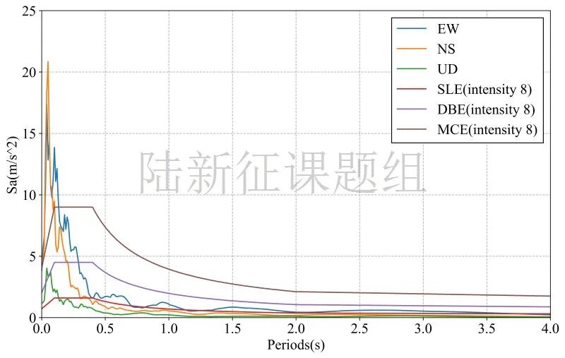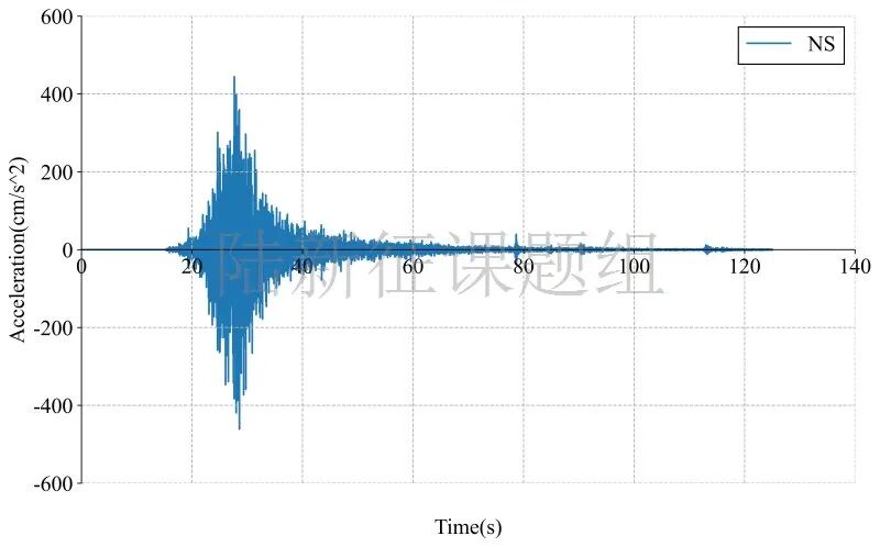 MYG011典型台站位置北纬38.31度,东经141.50度(图1,其中红色标记为震中位置),记录到水平向地震动峰值加速度为529.9cm/s/s,竖直向地震动峰值加速度为117.8cm/s/s。该地震动及反应谱如图2、图3所示。